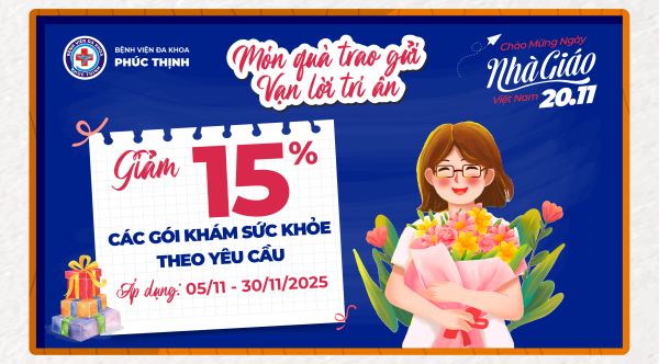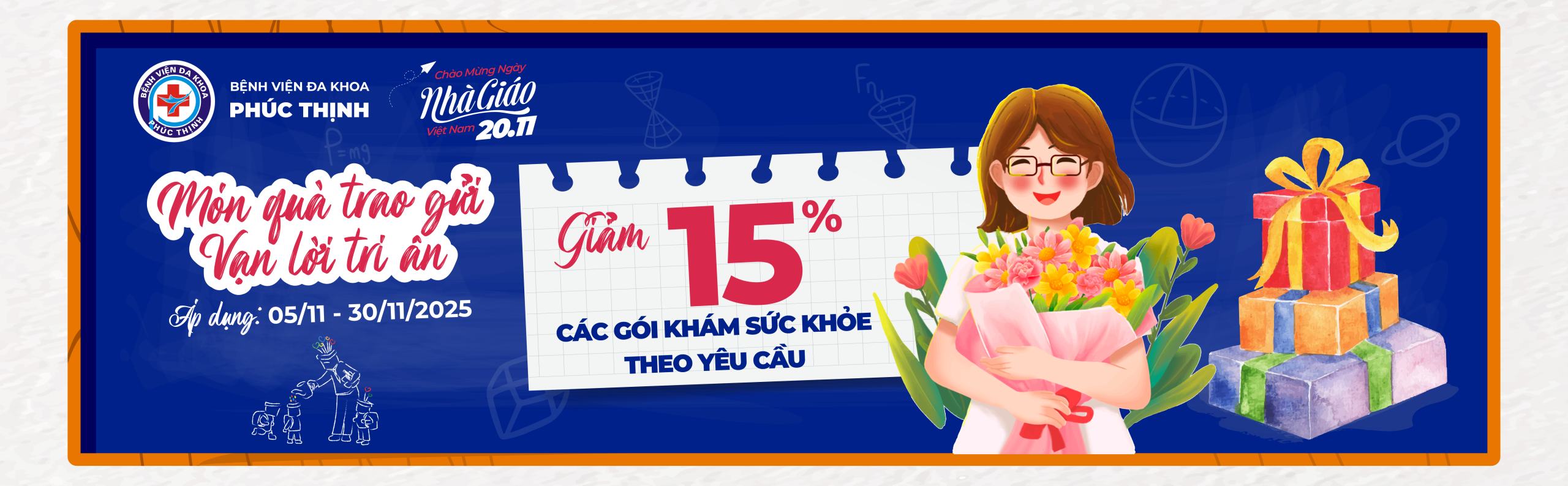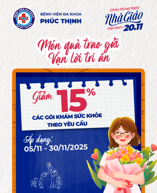 BVĐK Phúc Thịnh tặng ưu đãi 15% gói khám sức khỏe & cắt kính y tế cho giáo viên, học sinh, sinh viên. Chương trình tri ân từ 05–30/11/2025.