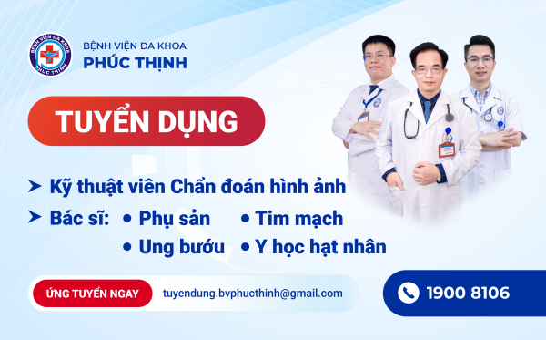 BVĐK Phúc Thịnh tuyển dụng bác sĩ Phụ sản, Tim mạch, Ung bướu, Y học hạt nhân và KTV CĐHA. Thu nhập hấp dẫn, môi trường chuyên nghiệp, cơ hội thăng tiến.